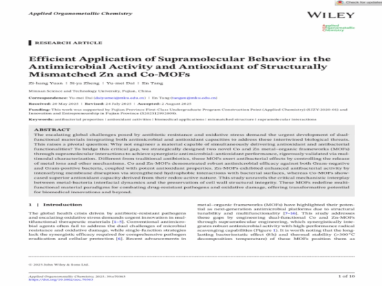 生命科学与化学学院2022级生物工程专业学生袁梓航、郑思雅,正是这个集体的受益者——她们以共同第一作者身份(指导老师:唐恩教授、戴玉梅教授),在SCI二区期刊《AppliedOrganometallicChemistry》(应用有机金属化学)在线发表研究论文,用亮眼成果印证了“个人拼搏”与“集体守护”的双向成就,满含坚持、互助与感动的科研旅程,更是温暖集体育人力量的生动写照。