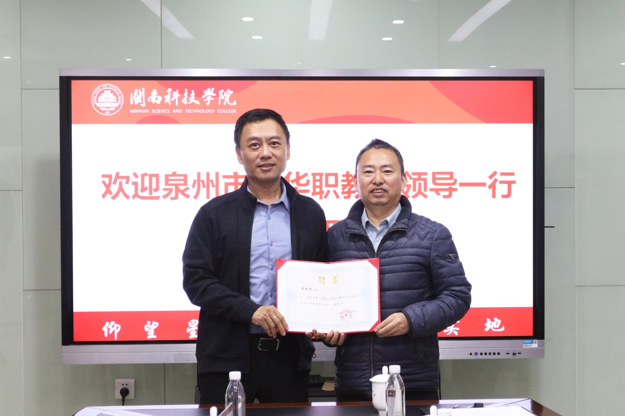 12月18日,泉州市中华职业教育社专职副主任、三级调研员卓晨雷一行在南安市委统战部常务副部长黄文金、副部长陈鸿杰,南安市康美镇党委秘书、统战委员李晓明等陪同下莅临我校,开展党建和思政工作调研,为省中华职业教育社专家库专家颁发聘书。校长助理刘武强、相关职能部门负责人参加调研并座谈。