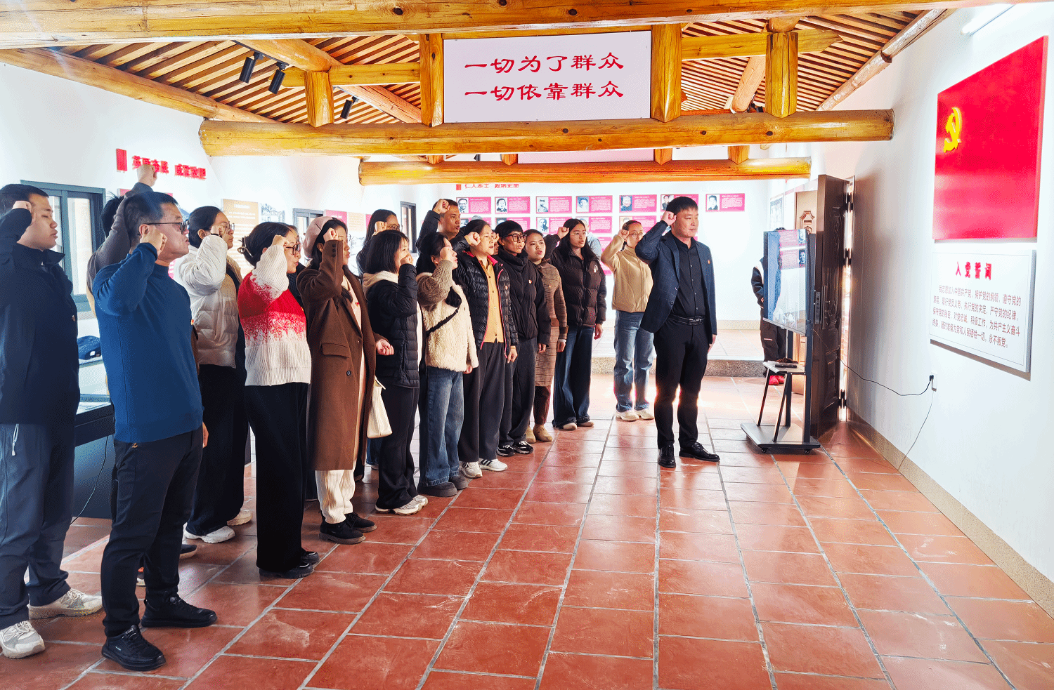 在福林村,教师党员们参观了晋南永边区革命历史展示馆,“百年征程”“风起云涌”“浴血奋战”“星火燎原”等展区,一张张泛黄的老照片、一件件珍贵的革命文物、一个个感人的英雄事迹,教师党员们近距离了解那一段艰苦而伟大的岁月,深切感悟革命先辈为民族独立、人民解放挺身而出、舍生取义的崇高气节与家国担当。期间,全体教师党员面向党旗庄严宣誓,重温入党誓词,在铿锵的誓言中,激励全体党员坚定理想信念,坚守入党初心。