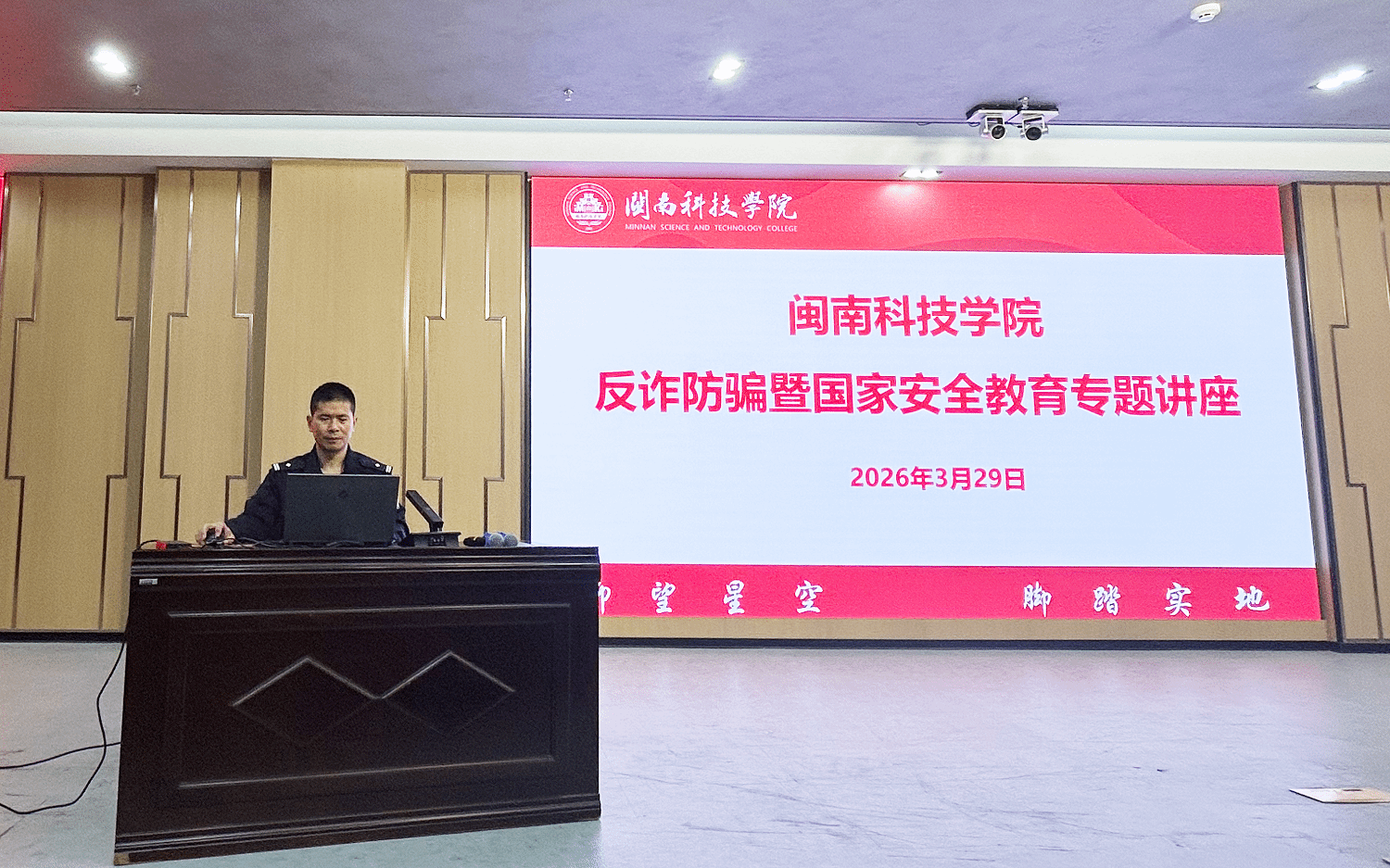 活动邀请南安市公安局柳城派出所综合指挥室副主任、三级警长黄评波,南安市公安局反诈大队四级警长黄振城担任主讲,围绕“反诈是门必修课 筑牢防线守好责”及“国家安全教育”主题,为师生带来了两场专题讲座。讲座深入剖析了当前电信网络诈骗的典型类型、作案手法与高发场景。同时,围绕国家安全相关法律法规开展普法宣传,引导师生树牢总体国家安全观,不断增强法治意识,自觉履行维护国家安全的责任与义务。