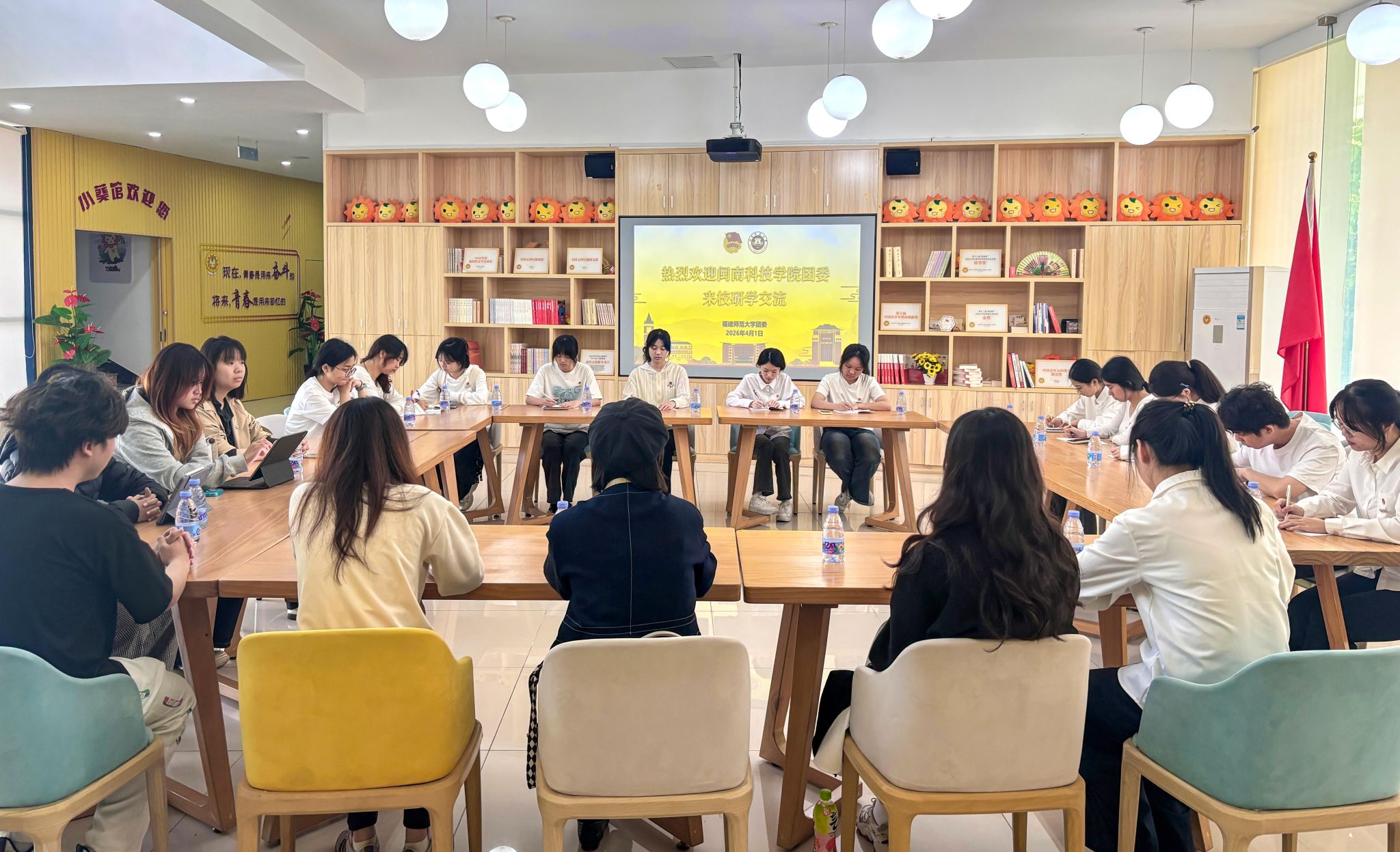 在福建师范大学,学员们参观了全国首个高校共青团思想引领新媒体线下体验馆“小葵馆”,沉浸式学习“小葵”IP建设经验,感受新媒体在思想引领中的创新作用。座谈会上,双方共同学习《习近平与大学生朋友们》,围绕品牌打造、新媒体运营、组织建设、思政实践等方面,就如何以青年需求为导向推进团学工作创新进行深入探讨。