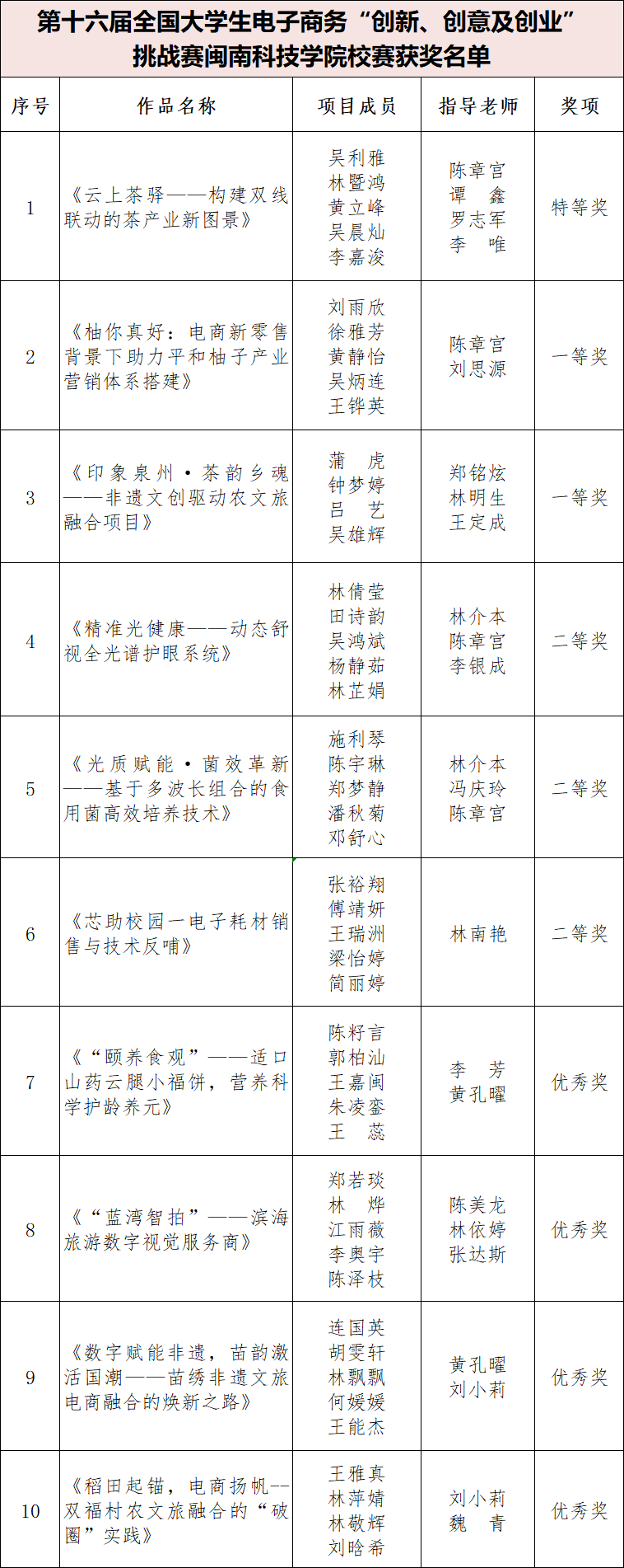 经过激烈角逐,最终评选出特等奖1项、一等奖2项、二等奖3项及优秀奖若干。其中,《云上茶驿——构建双线联动的茶产业新图景》(项目成员:吴利雅、林暨鸿、黄立峰、吴晨灿、李嘉浚,指导老师:陈章宫、谭鑫、罗志军、李唯)获得校赛特等奖。