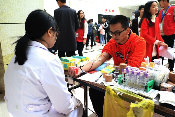 献血现场设有报名区、体检区、血检区、抽血区、领证区等,吸引了广大师生的踊跃参与,自愿为社会贡献自己的一份爱心。活动刚开始,同学们就积极地前往献血现场,或咨询献血相关事宜,或有秩序地填写《献血登记表》,在志愿者的协助下,医生了解前来献血同学的健康状况后,依次进行体检、验血、采血的献血流程,整个现场井然有序。短短一天时间,学院师生献血人数多达500人。