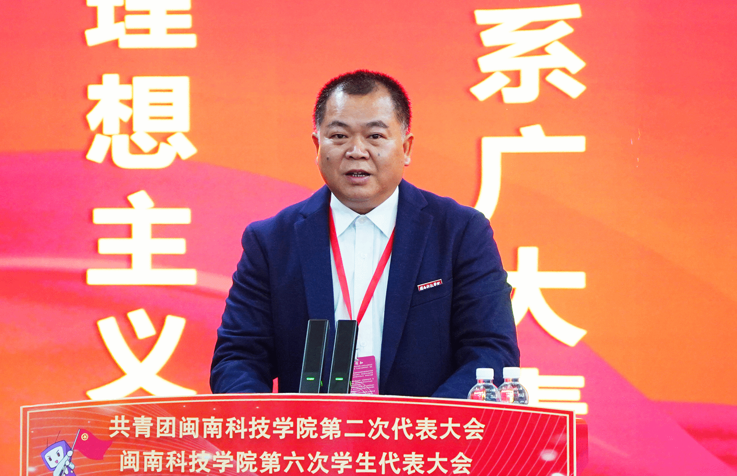 泉州信息工程学院团委书记李博诗代表兄弟高校致贺词。福建师范大学、华侨大学、集美大学、闽江学院、泉州师范学院、龙岩学院、福建商学院、黎明职业大学、泉州信息工程学院、厦门华厦学院、闽南理工学院、仰恩大学、泉州职业技术大学、泉州医学高等专科学校、福建电力职业技术学院、泉州工艺美术职业学院、泉州轻工职业学院、泉州海洋职业学院、泉州工程职业技术学院等高校团学组织发来贺信。