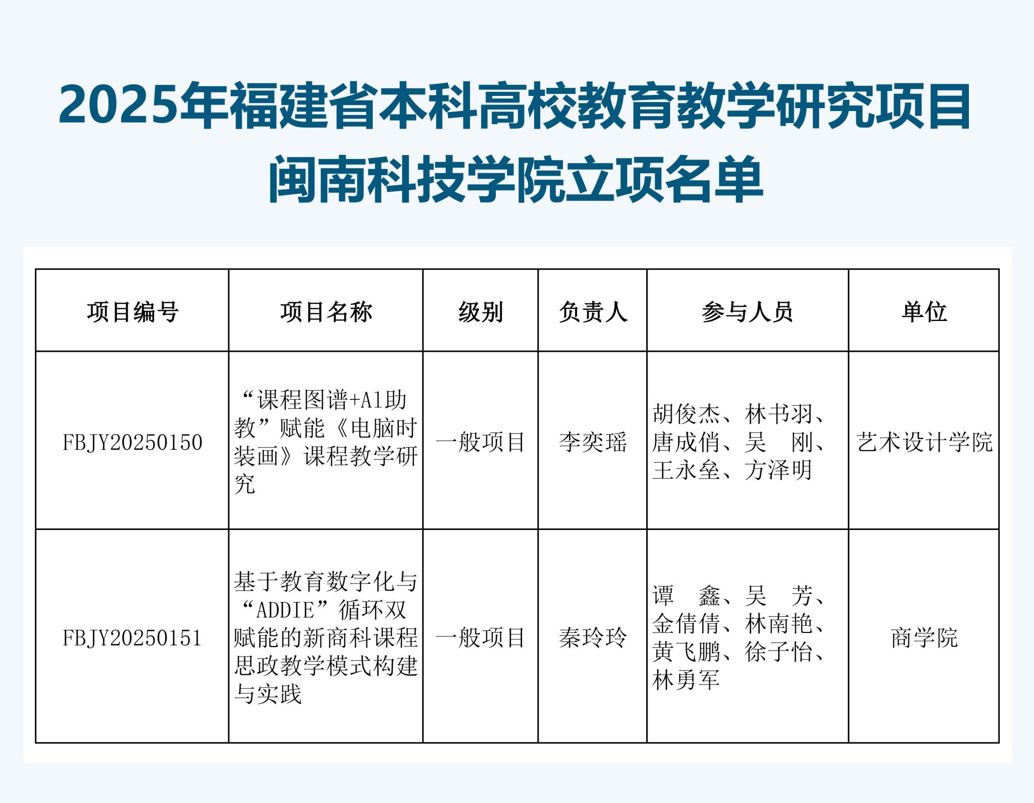 日前,福建省教育厅发布了《福建省教育厅关于公布2025年本科高校教育教学研究项目立项名单的通知》(闽教高〔2025〕24号),我校获批本科教育教学研究项目一般项目2项。