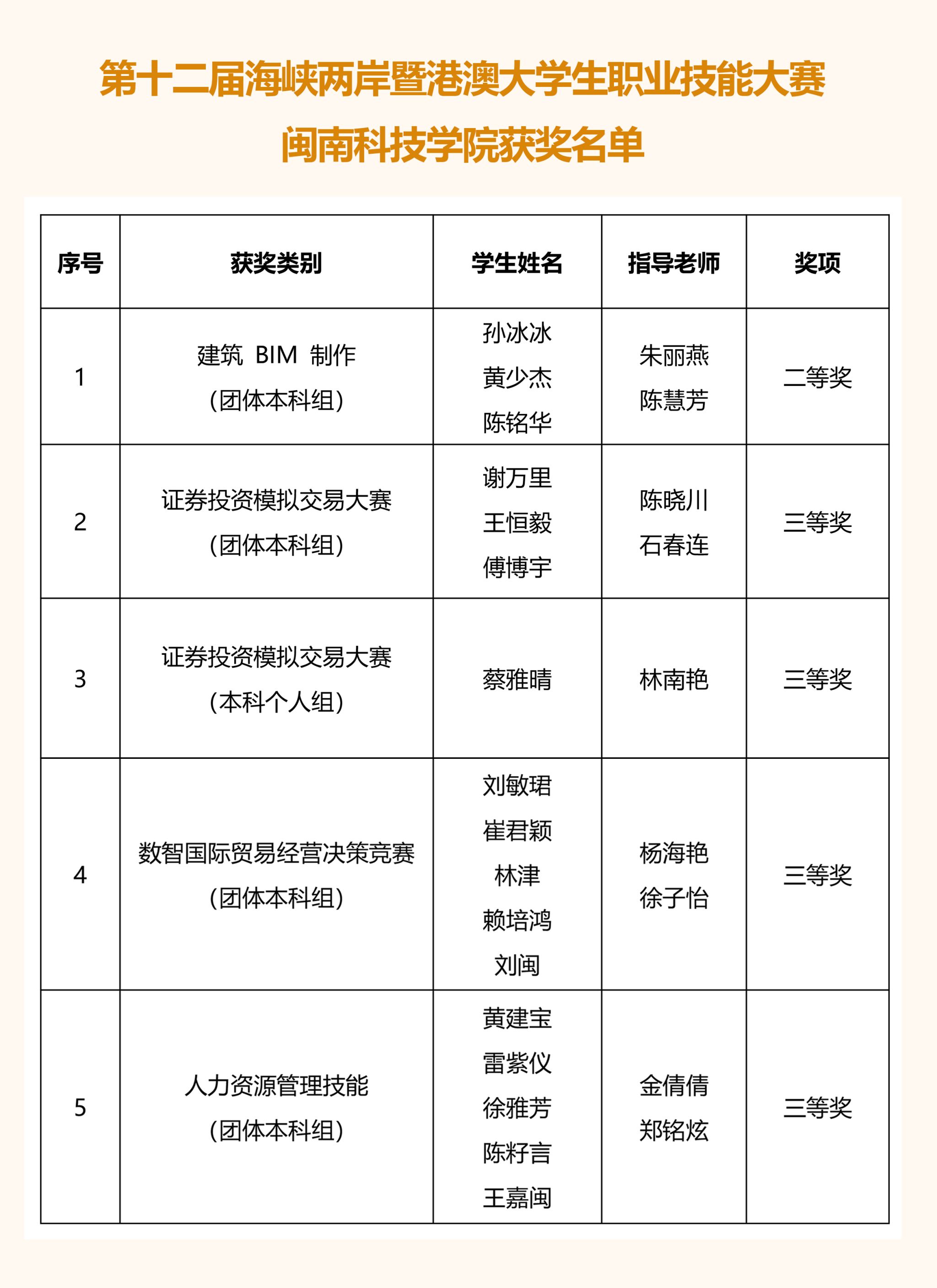 近日,第十二届海峡两岸暨港澳大学生职业技能大赛赛事结果公布,我校学子参与多个竞赛项目角逐,凭借扎实的专业素养与创新实践能力,在赛事中获得二等奖1项、三等奖4项。