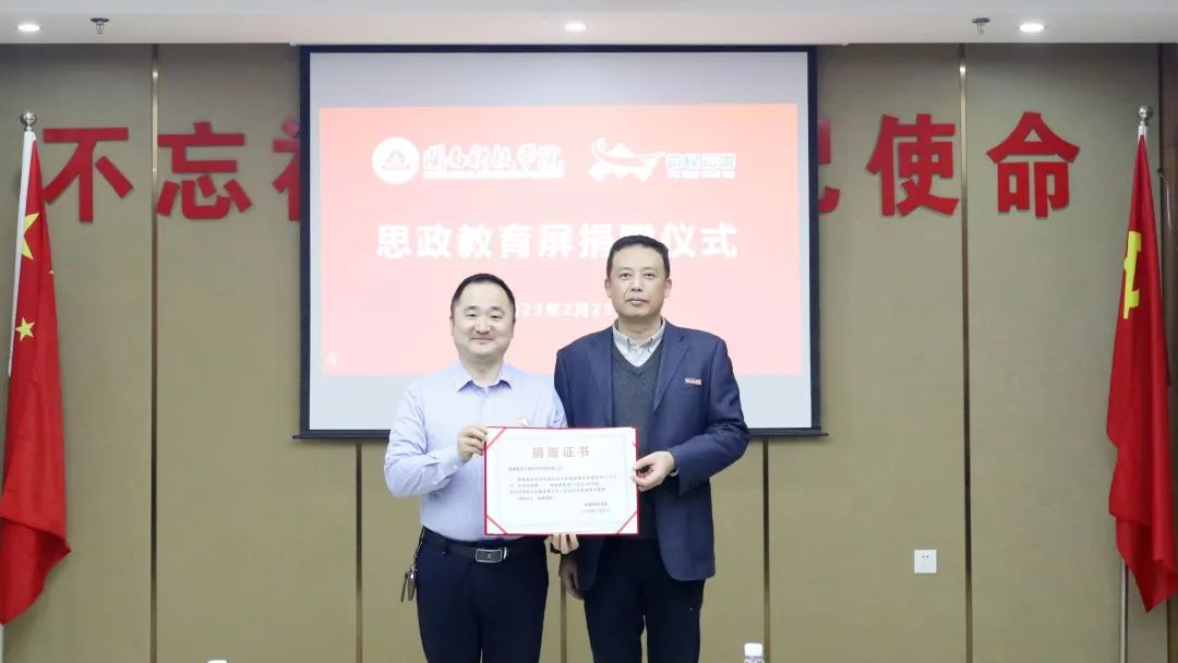 “百校千屏”思政教育屏捐赠活动由福建创智联盟数字教育科技有限公司联合福建富民云咖集团共同发起,分别提供设备和耗材,福建创智联盟数字教育科技有限公司是海峡出版发行集团旗下全资子公司。此次捐赠的思政教育屏将服务于全校师生,开辟了校内的思政宣传教育新阵地。校企双方共建实践教学基地,将积极打造“党建+思政+产教融合+平台”模式,整合校企资源,共建产学研合作。